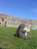Veverka na nádvoří hradu v Denbighu (severní Wales)