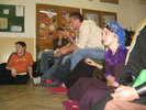 Lovci Veverek si vyměňují zážitky s Katyinou družinou.