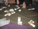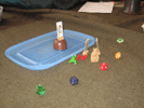 Na kalíšku to je Tidli na střeše domu, žabka je klasicky Laureo, 4 „kamínky“ jsou odvážní vesničané, Gandalf (šedo-modrý plášť a klóbrc) je Andúne, staroanglická figurka krále je Edhel, postavička otočená bokem Maira a kostky s „kamínky“ jsou ohně. Kočky tam nejsou, jsou mrtvé:)