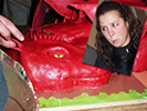 Ukázalo, že ještěr zřejmě právě vyžral cukrárnu, takže bylo bezpečné ho naporcovat a rozdělit mezi všechny účastníky Úsvitconu.
